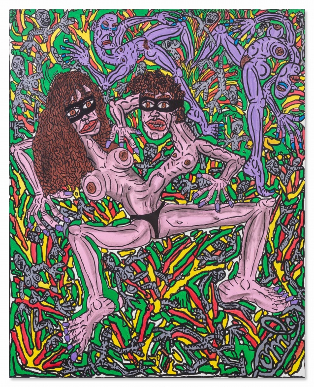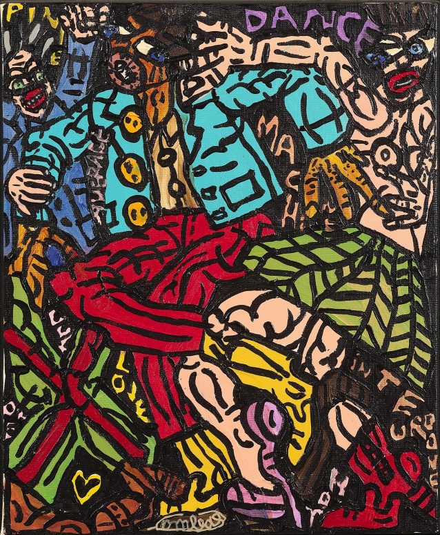 Peinture faite de libertés, l’oeuvre de Combas évoque la société, sa violence, la sexualité, la souffrance comme les petits bonheurs… Elle s’inspire du rock dont l’artiste est un fin amateur, d’images populaires, des livres d’enfance, des manuels scolaires, bref de tout ce qui fait une culture populaire et accessible à tous.
